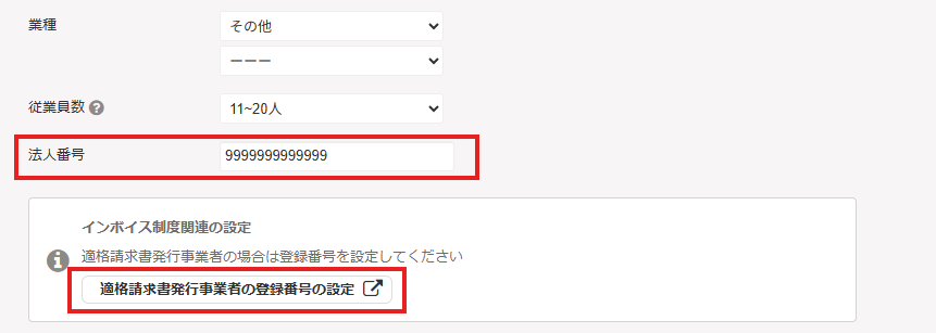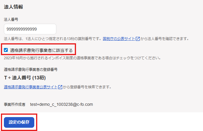 適格請求書発行事業者の場合は、この画面で法人番号を入力し、「適格請求書発行事業者の登録番号の設定」をクリックして設定を行うことで、請求書にT番号が表示されるようになります。