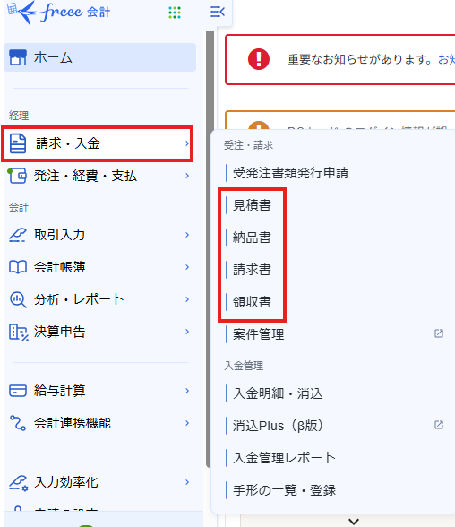 freee会計から移動する場合には、[請求・入金]→[見積書]・[納品書]・[請求書]・[領収書]のいずれかをクリックすると、freee請求書が開きます。