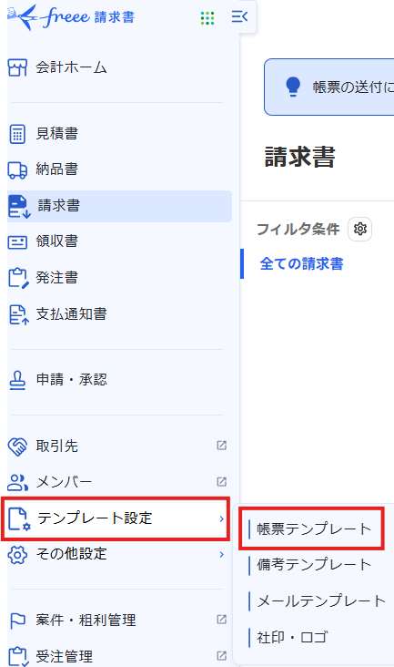 [テンプレート設定]→[帳票テンプレート]をクリックします。