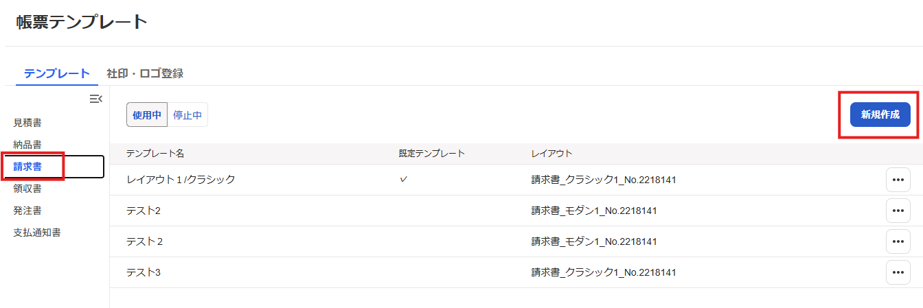 開いた画面左側で、テンプレートを作成する書類を選択し、[新規作成]をクリックします。