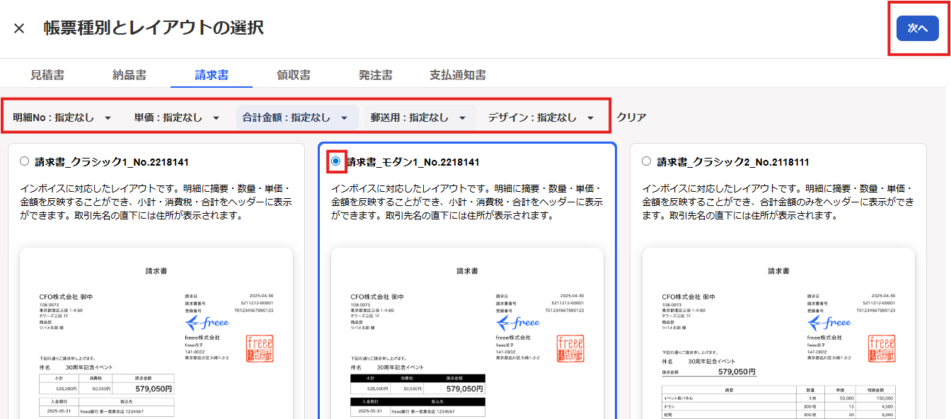 「窓付き封筒で郵送するか」や「内訳ごとに明細Noを記載するか」で適したレイアウトが異なりますので、自社の運用にあったレイアウトを選択しましょう。