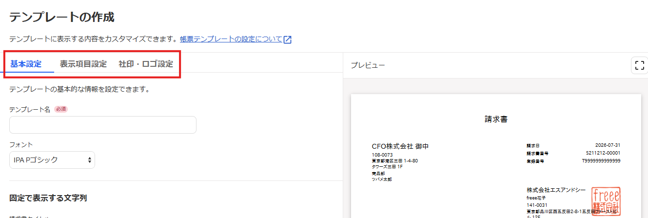 「基本設定」「表示項目設定」「社印・ロゴ設定」をそれぞれ行います。