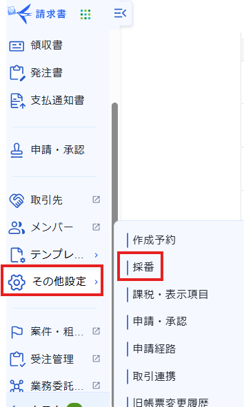 freee請求書のメニュー欄から、[その他設定]→[採番]をクリックします。