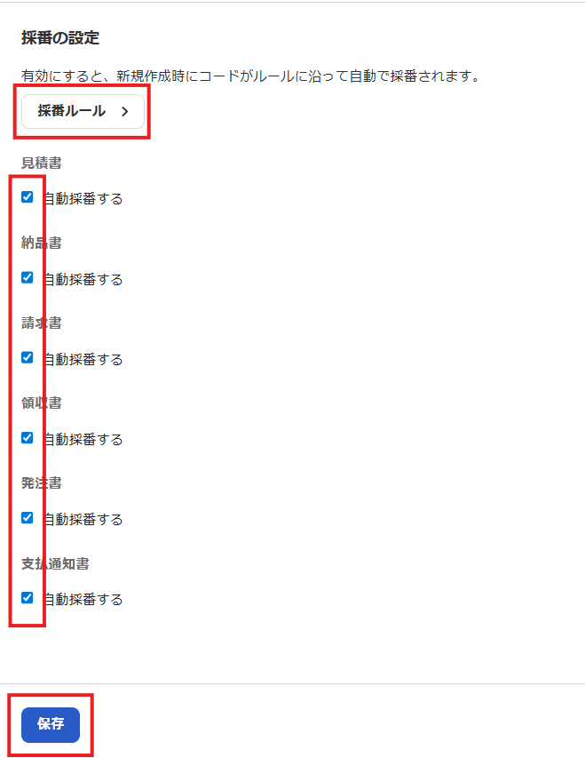 自動採番をする場合には、「自動採番する」にチェックを入れて[保存]し、[採番ルール]をクリックします。