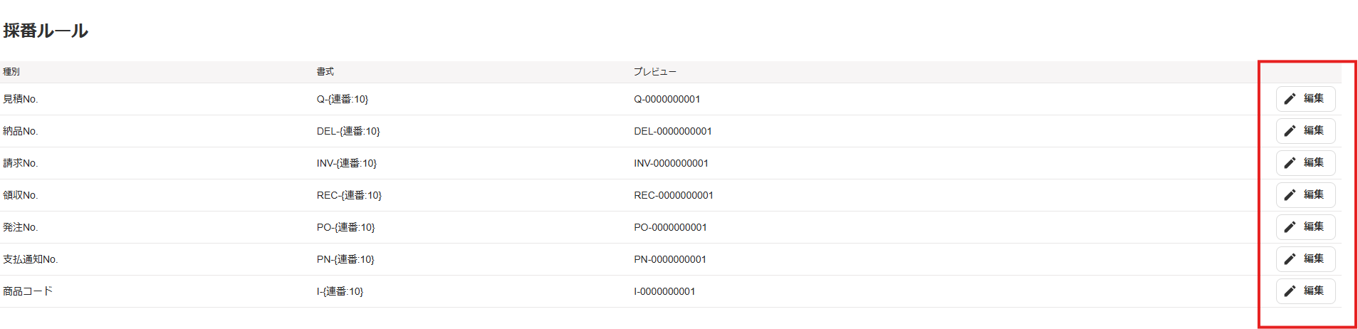 「採番ルール」画面でルールを設定したい書類行の[編集]をクリックします。