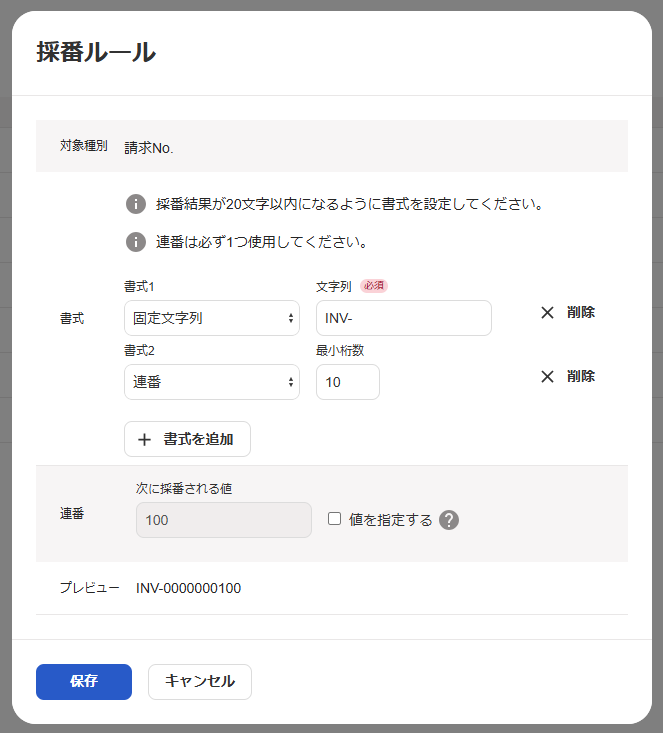 番号の頭に固定文字列を入れる、請求日を入れる、などのルールを設定することができます。