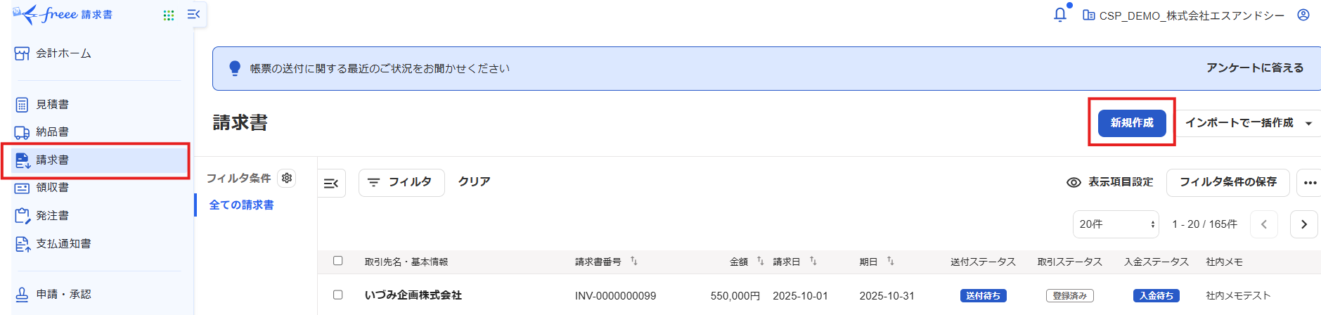 freee請求書画面左側のメニューより、[請求書]をクリックし、[新規作成]を開きます。