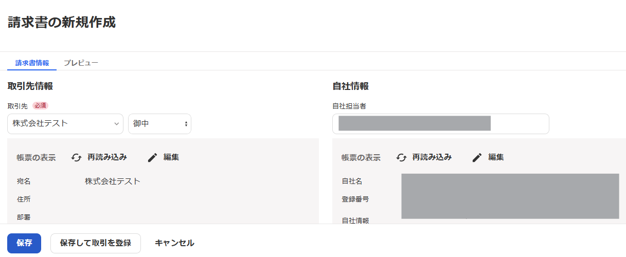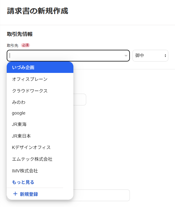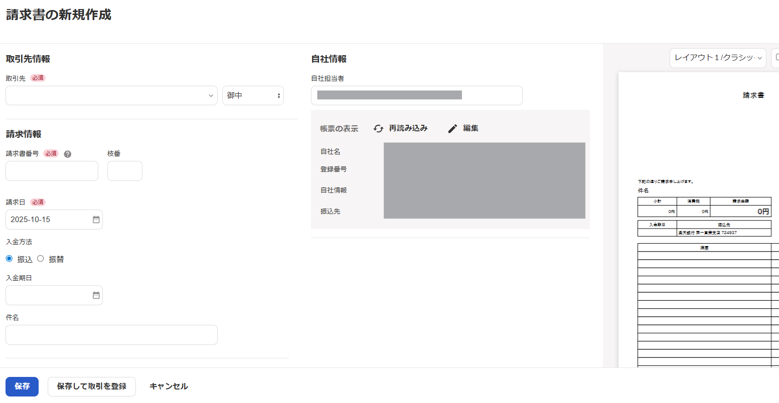 「請求書の新規作成」画面が開くので、必要項目を入力します。