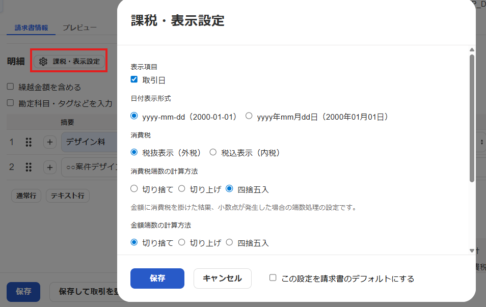「表示項目設定」では請求書上の各項目に対して、表示のオン・オフ切替や表示名称のカスタマイズができます。