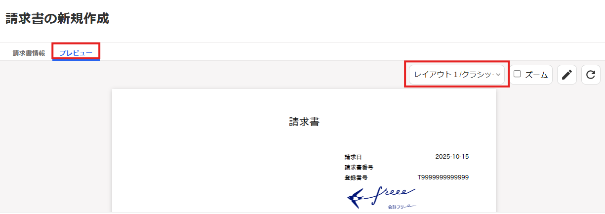 freee請求書を開いて、書類のレイアウトや社印等の設定を行います。