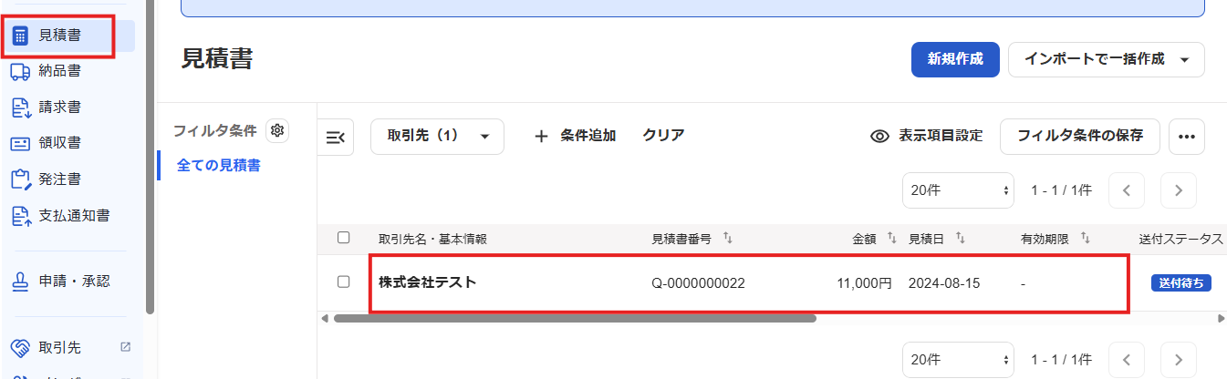 freee請求書画面左側のメニューより、変換元の書類名(見積書もしくは納品書)をクリックして一覧画面を開き、該当の書類をクリックします。