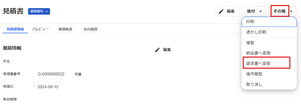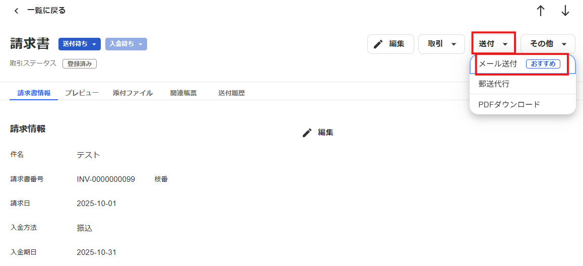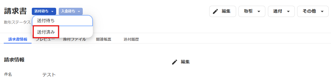 請求書の送付が完了したら、該当の請求書画面でステータスを「送付済み」に変更します。
