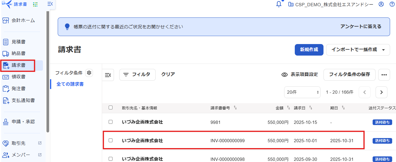 freee請求書画面左側のメニューより、[請求書]をクリックし、送付する書類の行をクリックして請求書を開きます。