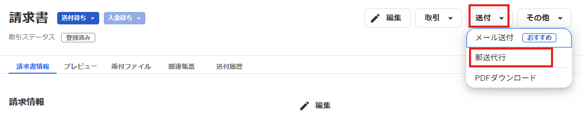 該当の請求書を開き、[送付] →[郵送代行]をクリックします。