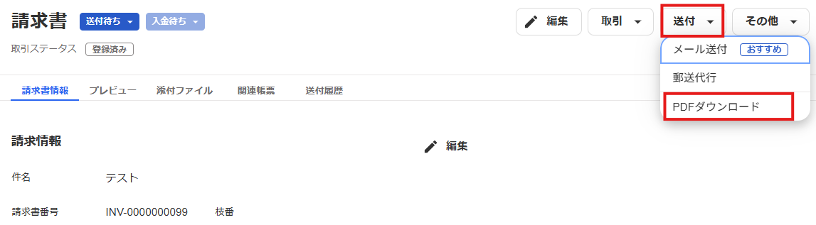 該当の請求書を開き、[送付] →[PDFダウンロード]をクリックすると、PDFデータがダウンロードされます。