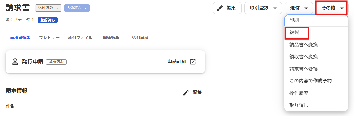 複製元の請求書を開いたら、[その他]→[複製]をクリックすると、元の内容を引き継いだ上で「請求書の新規作成」画面が開きます。
