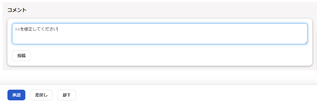 申請内容に不備があり差戻しをする際に、どのように修正して欲しいのか等をコメントで申請者に伝えることができて便利です。