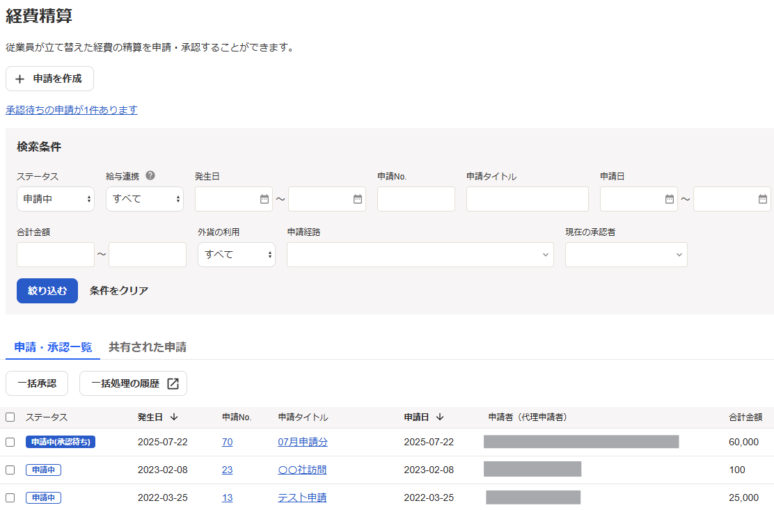 検索条件からステータスを絞り込んで表示することで、承認漏れがないか等のチェックに利用できます。