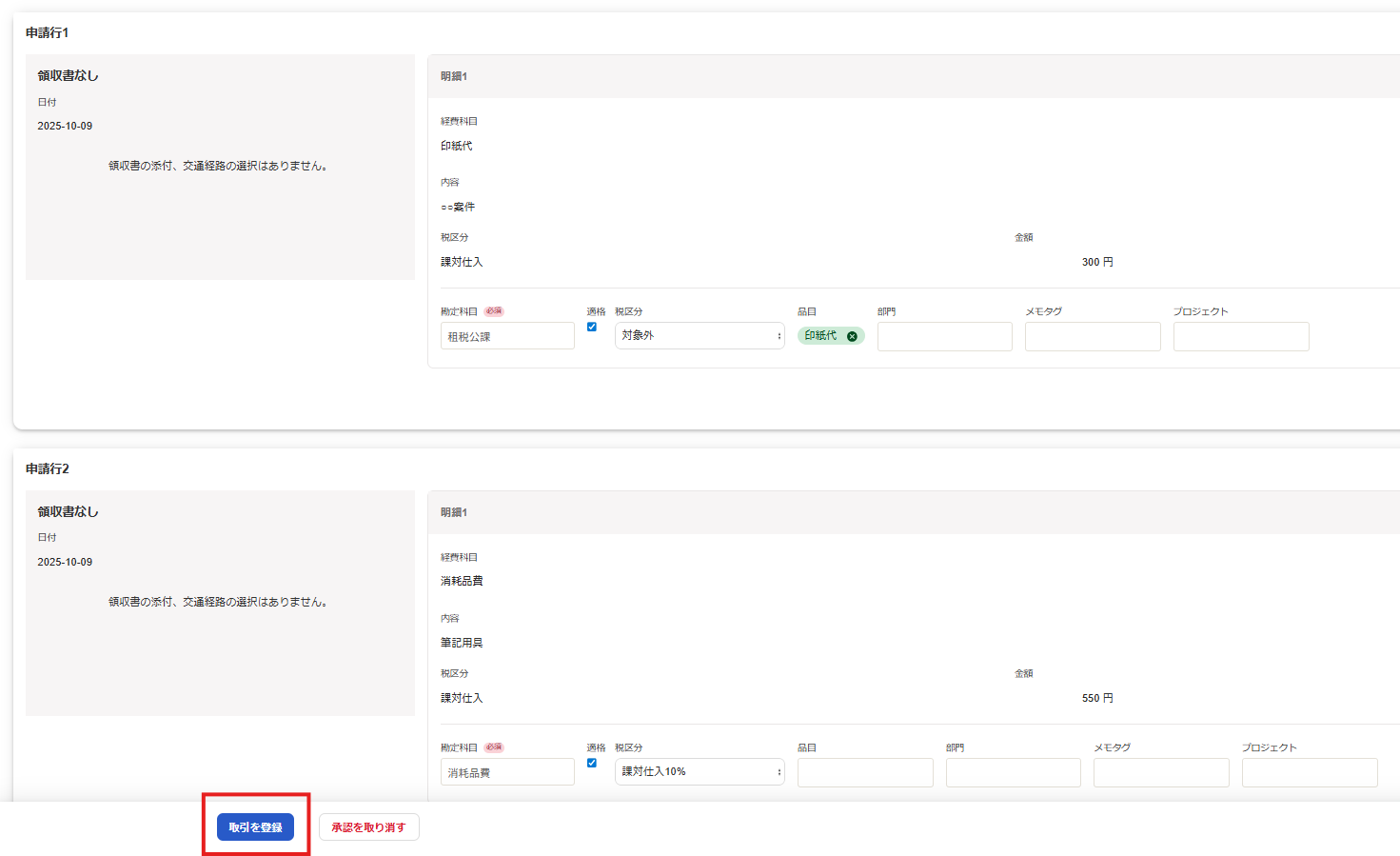 経費申請のステータスが「承認済」になると、取引の登録権限を持っているアカウントは経費申請の内容から取引(仕訳)を登録することができます。