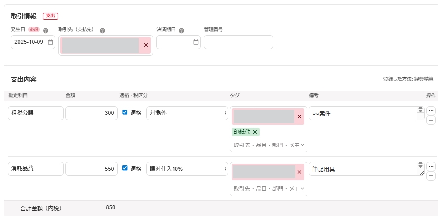 経費申請時に入力された内容が取引にも自動で反映されるため、一から登録する必要が無く便利です。