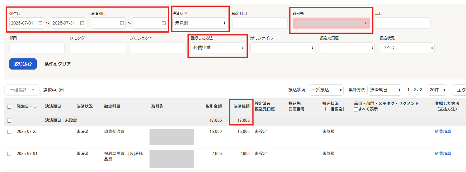 振込等で経費の精算が終わったら、作成した未決済取引の消込(決済の登録)を行います。