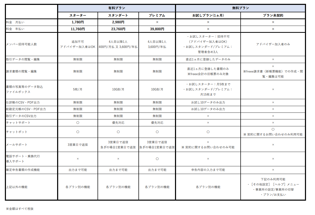 プラン未契約は機能制限があり、「取引データの閲覧・編集」や「請求書類の閲覧・編集」など基本的な機能に制限が掛かります。